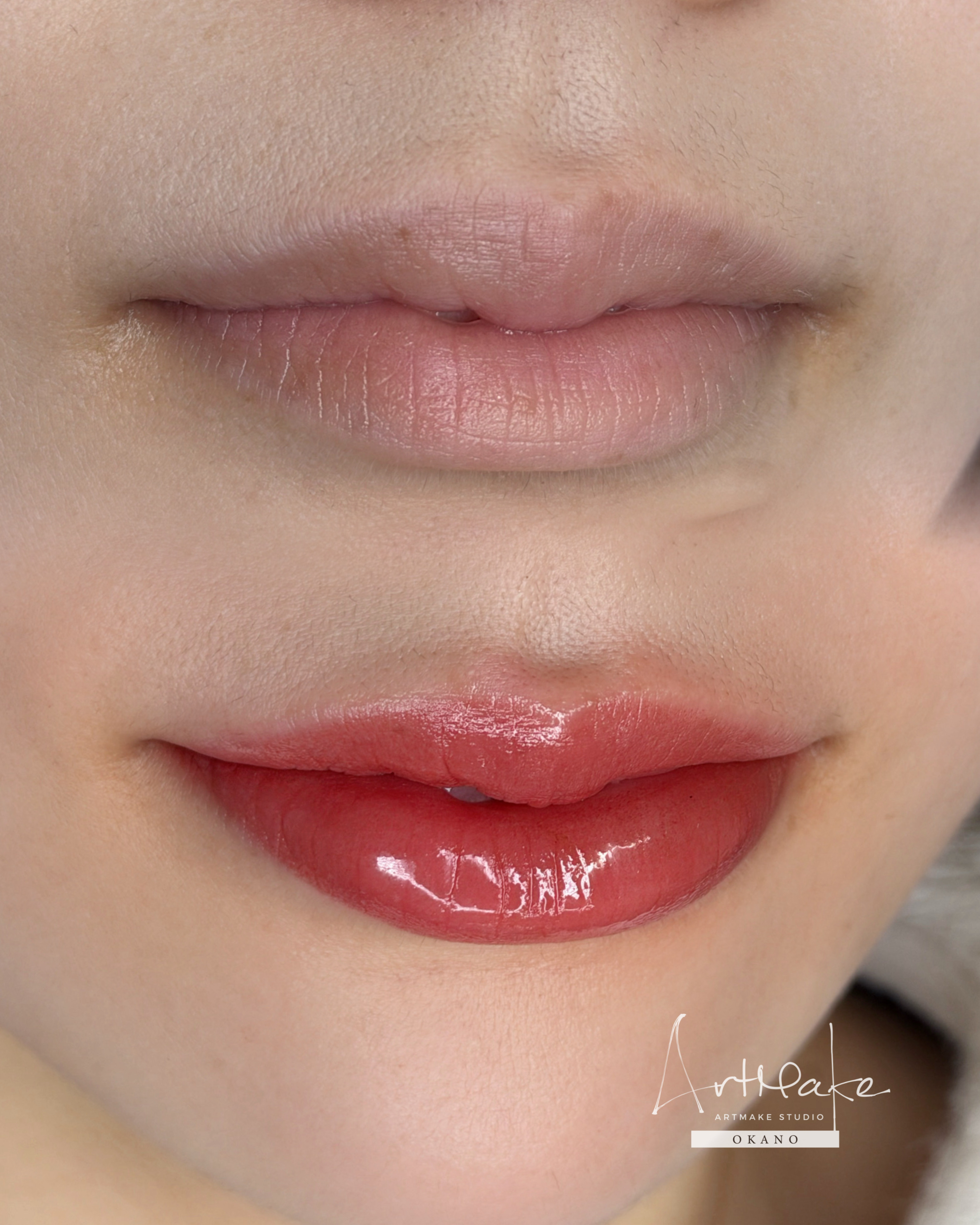 デザインポイント 青白さが目立つタイプの唇。 お肌のタイプ的にもコーラル感は強く入れずに、顔馴染みのよい血色ピンクに定着するようなカラーを初回使用しました。 土台の状態を整えて、2回目以降でさらに好みの色に近づけます。