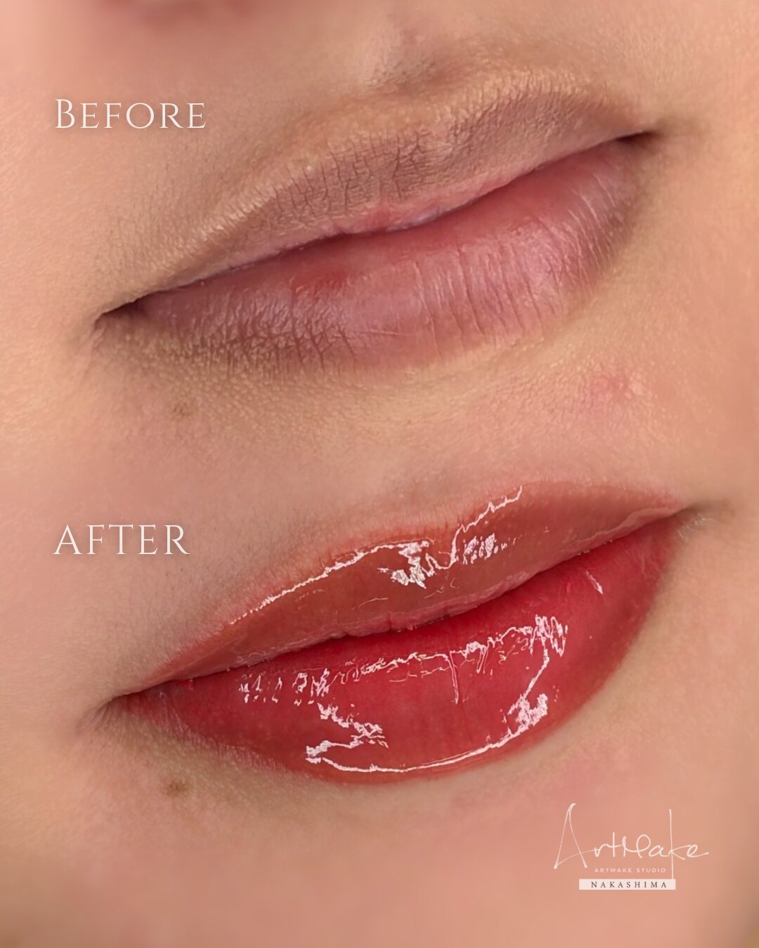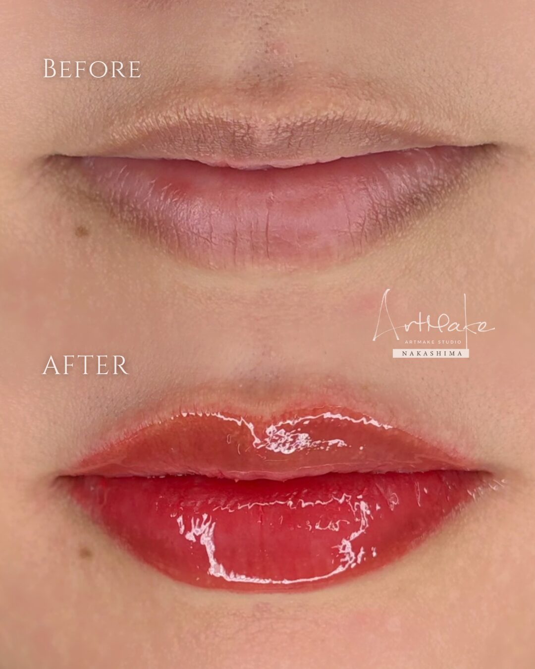 | デザインポイント | くすみ改善目的で、土台となる1回目はまずトーン補正を。ここから約3割ほどが定着し、土台が整えば2回目に好みのカラーをのせていきます。 またデザインに関しては、唇全体がふっくらと立体感ができるよう、輪郭も整えました。 |